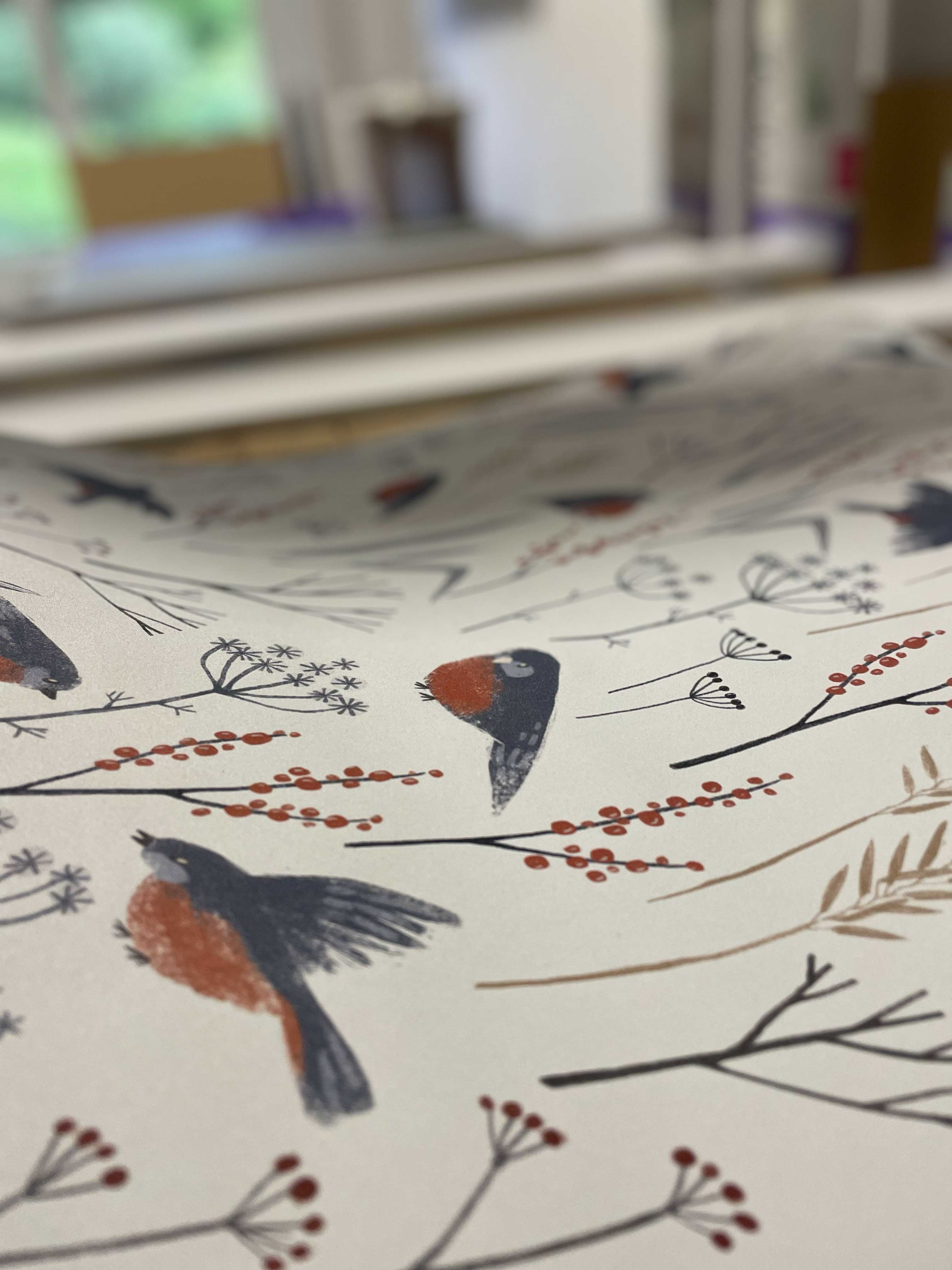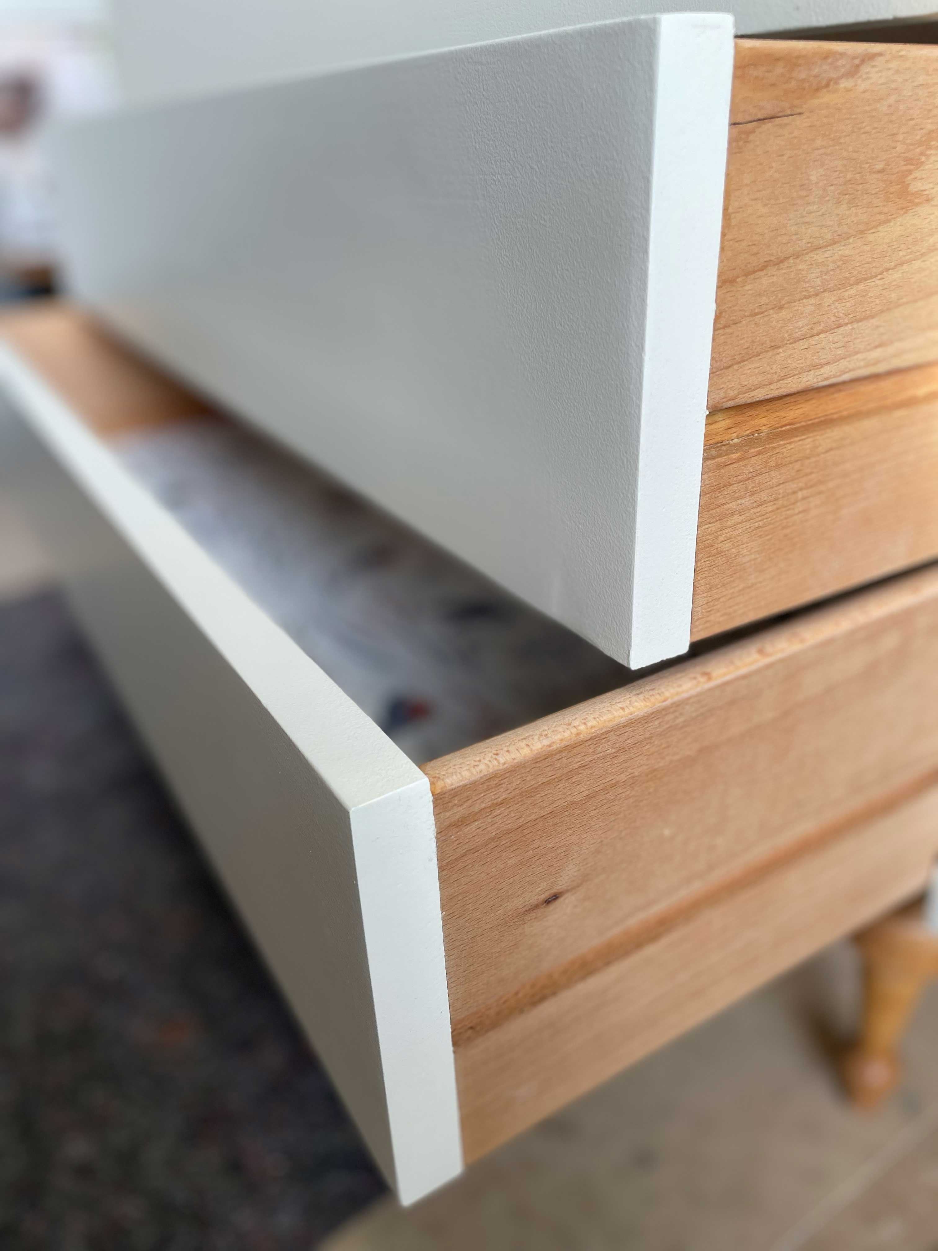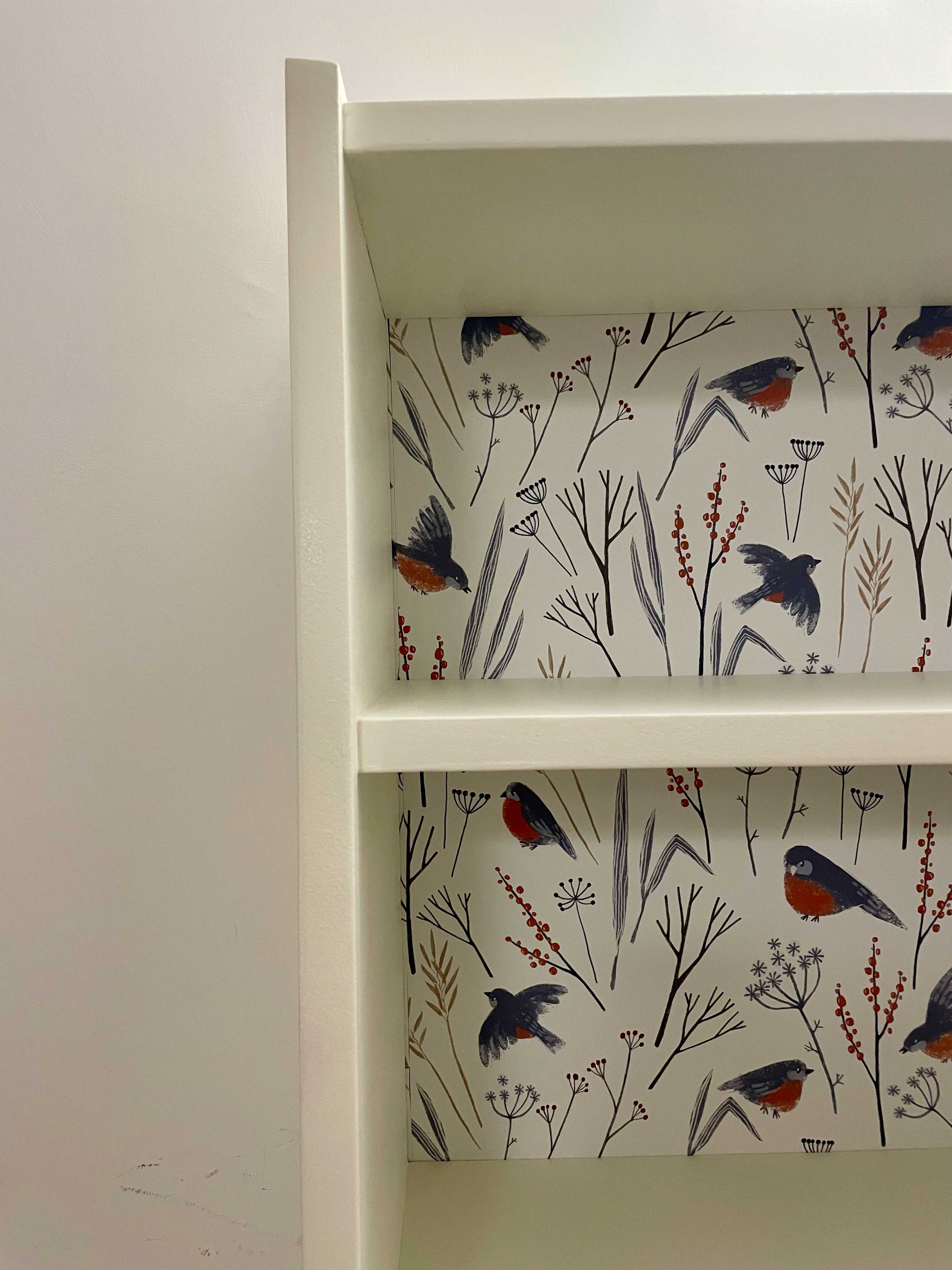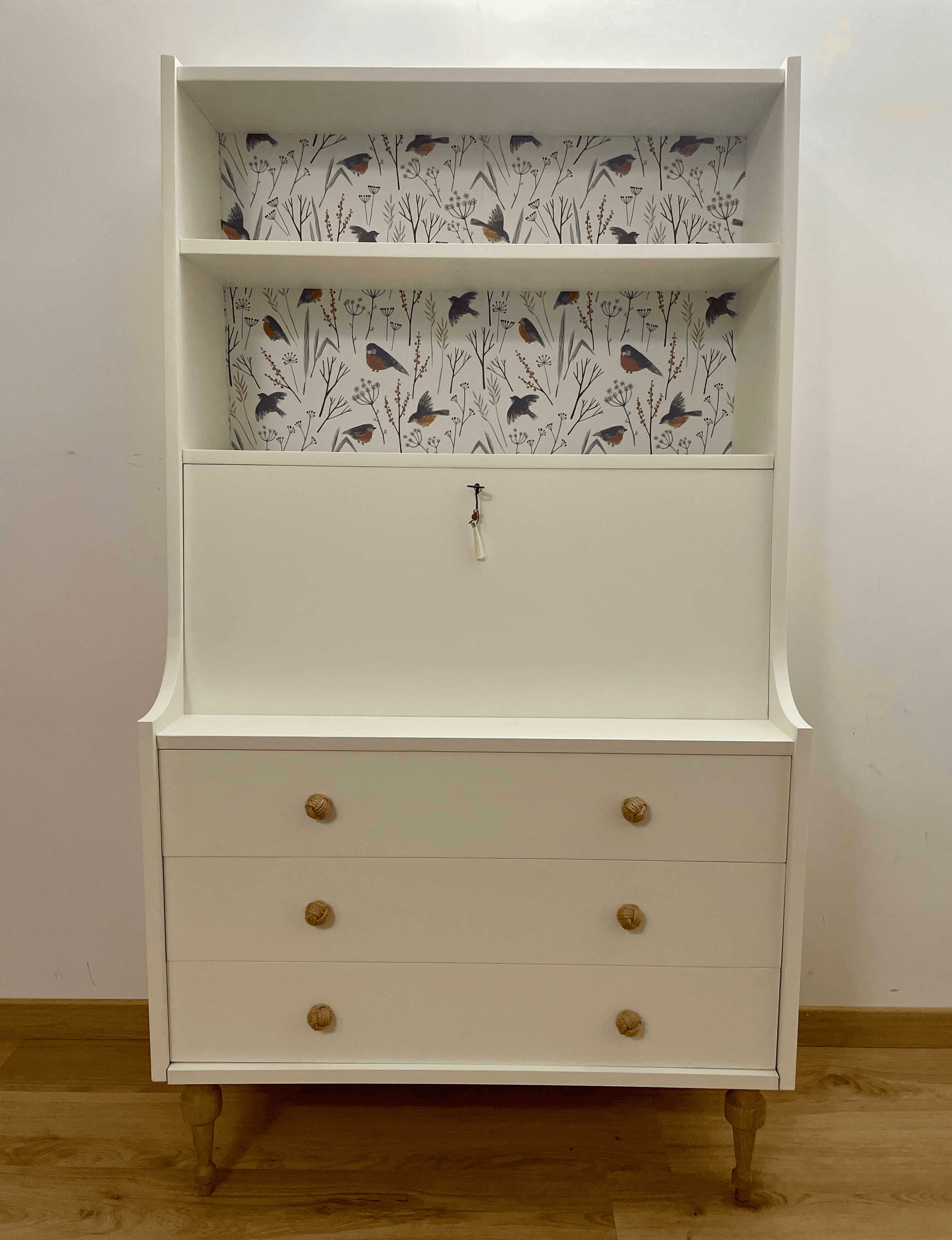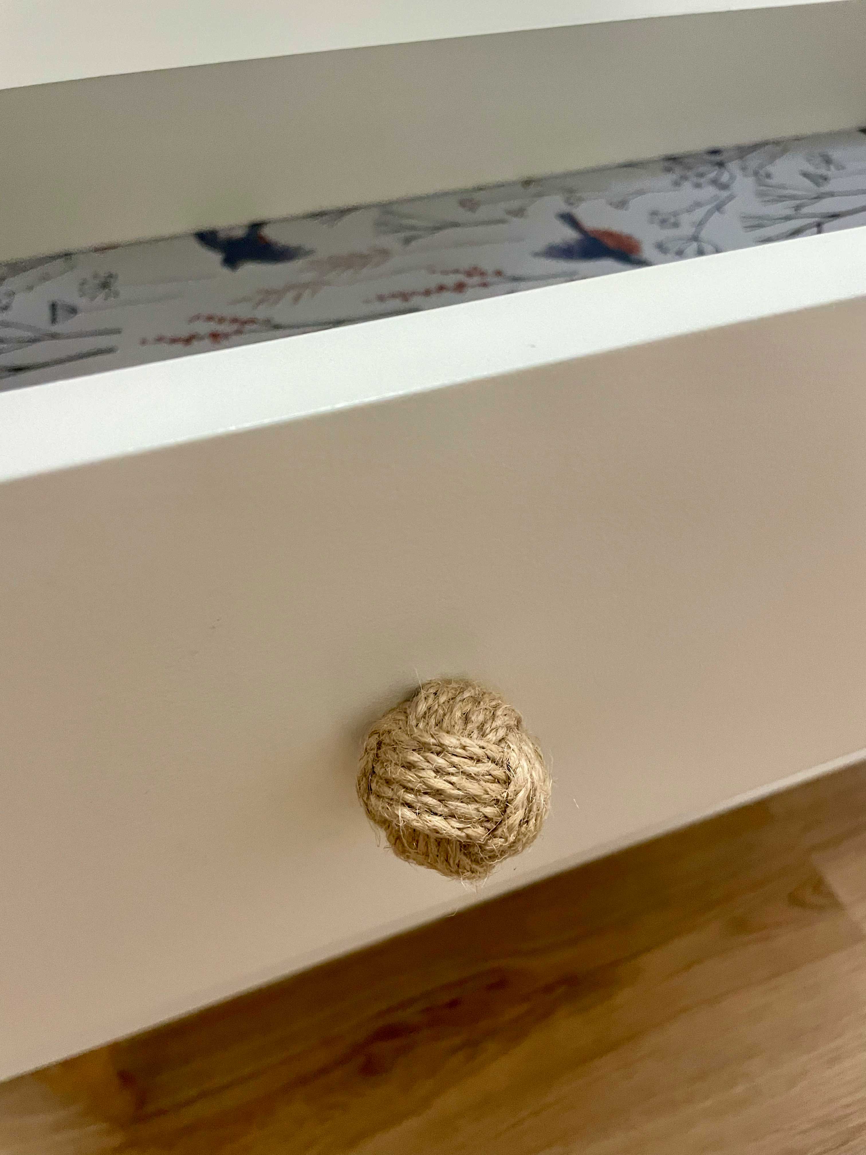 La ridipingo con una spruzzata di color vaniglia — delicato ma deciso. Per il pannello posteriore scelgo una carta adesiva dal gusto poetico: uccellini blu e rossi su stampa giapponese. Un tocco romantico (anche se Marcella sotto sotto vorrebbe essere rock’n’roll). Gambe in legno naturale, maniglie in corda: forme essenziali, materiali sinceri.
